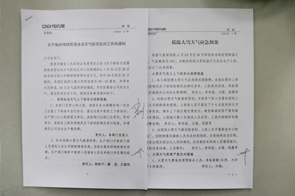 ? ? 此前根據省市部門氣象預報信息,為做好持續雨雪冰凍天氣防范應對工作,確保安全生產,公司提前組織制定了《低溫大雪天氣應急預案》。