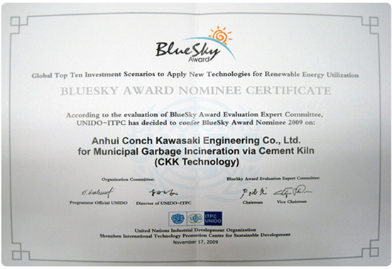 海螺創業利用水泥窯處置生活垃圾技術獲得聯合國“藍天獎”提名