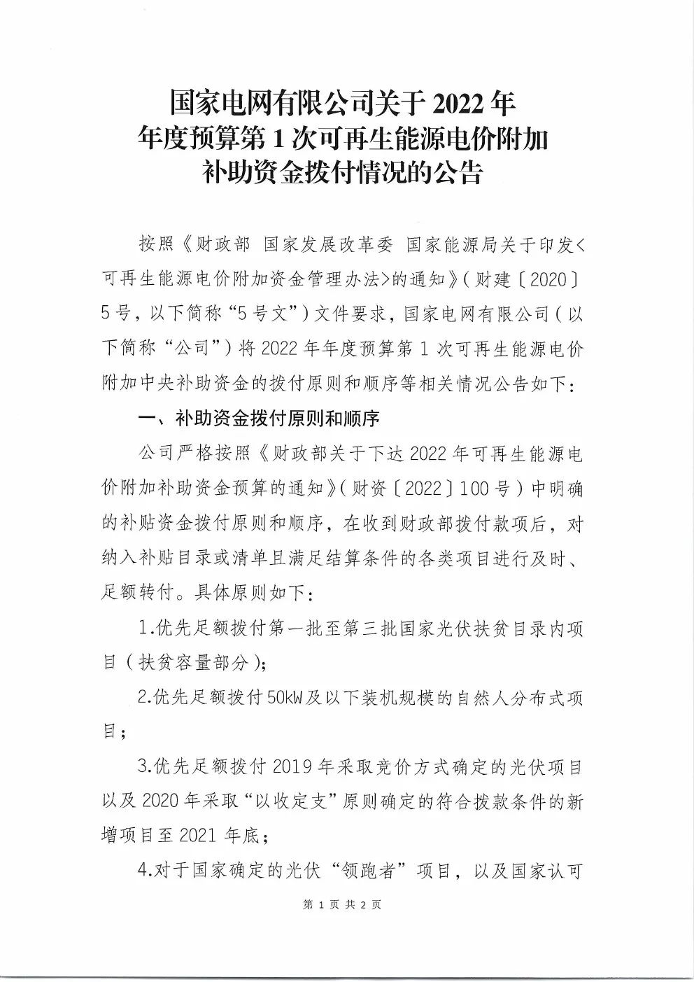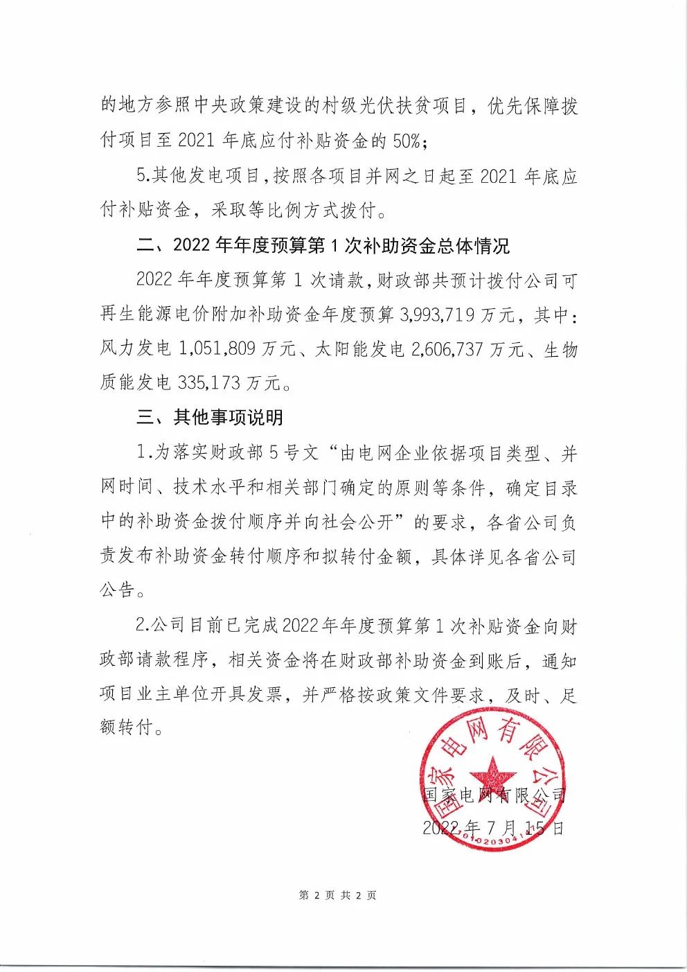 7月15日,國家電網公司發布《國家電網有限公司關于2022年年度預算第1次可再生能源電價附加補助資金撥付情況的公告》,發布2022年第一批補貼資金!文件指出:2022年年度預算第1次請款,財政部共預計撥付公司可再生能源電價附加補助資金年度預算3,993,719萬元,其中:風力發電1,051,809萬元、太陽能發電 2,606,737萬元、生物質能發電335,173萬元。