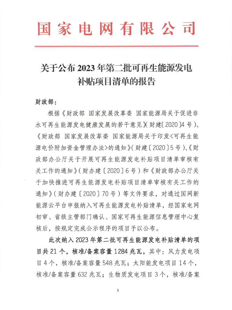 關于公布2023年第二批可再生能源發(fā)電補貼項目清單的報告